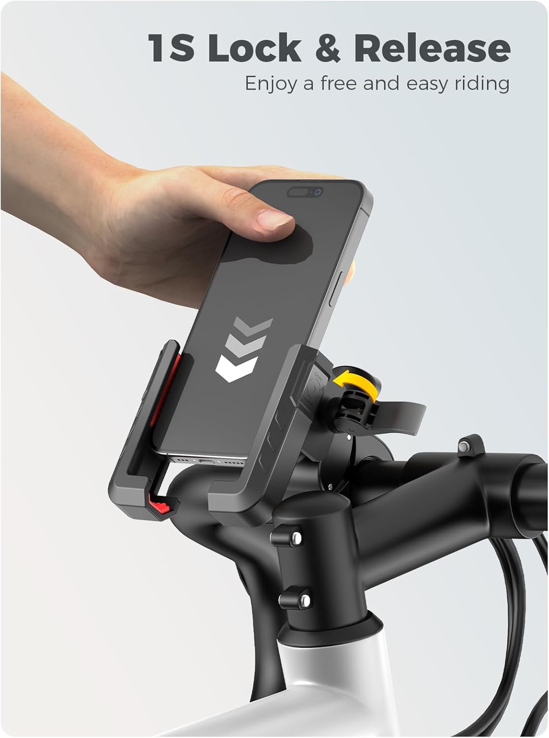 • Hold Your Phone Like Vise Triple Protection and Grip. This motorcycle phone mount is double reinforced with high-density material, making it more robust and durable to use than others. Both two sides are premium silicone padds, effectively protect your phone from scrathy and 3x anti-. Comes with 0.1s double-lock switch, your phone is safe even when you hit 50mph on bumpy road.