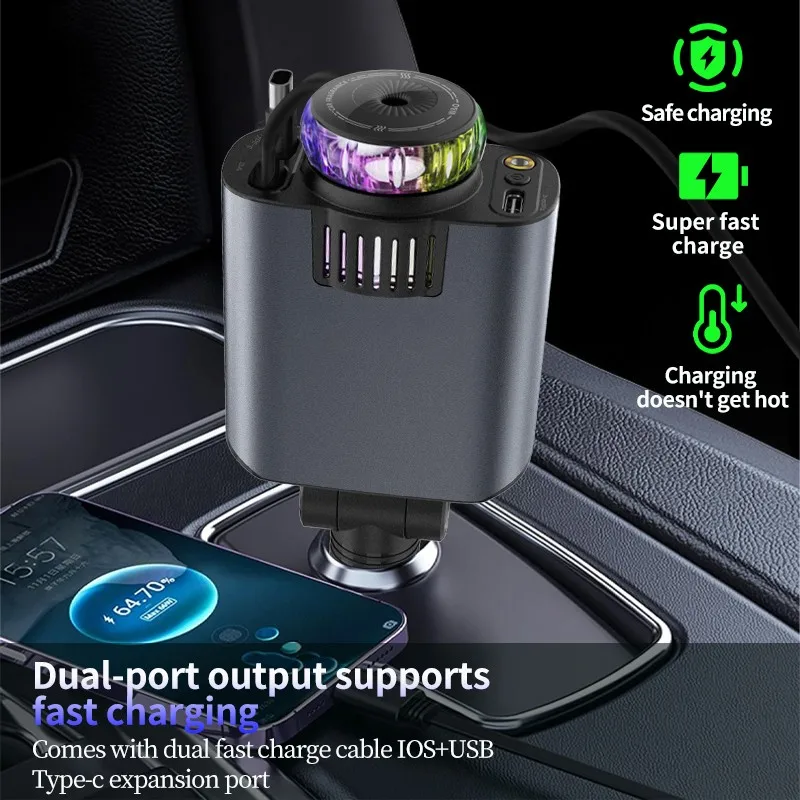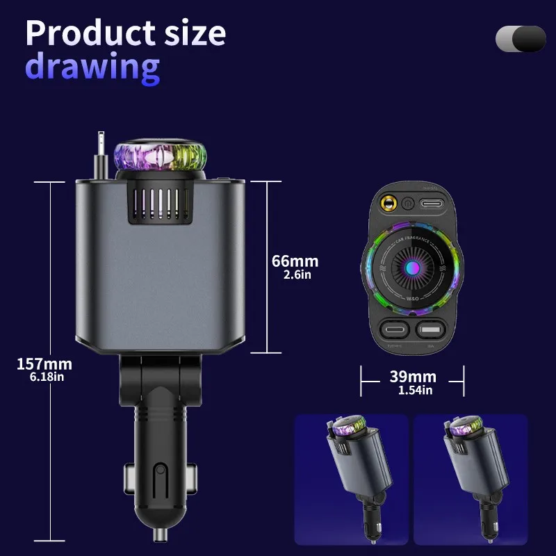 Description:-Multifunctional design: This car mobile phone charger not only has a charging function, but also comes with an aromatherapy design and starry sky lights. It integrates a variety of practical functions, one thing for multiple uses, convenient and practical.-Fast charging: Supports three-in-one super fast charging, which can provide fast charging for mobile phones, tablets and other devices at the same time, saving charging time and ensuring that the device always keeps sufficient power during driving.-Starry sky light effect: With a purple starry sky light design, it illuminates the interior space of the car, creates a romantic and dreamy atmosphere, brings a comfortable and peaceful feeling to the driver and passengers, and increases driving pleasure.-Aromatherapy design: Built-in aromatherapy function, aromatherapy tablets or aromatherapy oil can be added to release a light fragrance, purify the air in the car, remove odors, improve the air quality in the car, and make driving more comfortable.-Odor removal: The cigarette lighte r deodorization function can quickly and effectively remove bad odors such as smoke and odor in the car, keep the air in the car fresh, improve driving comfort, and create a pleasant driving environment for you.
