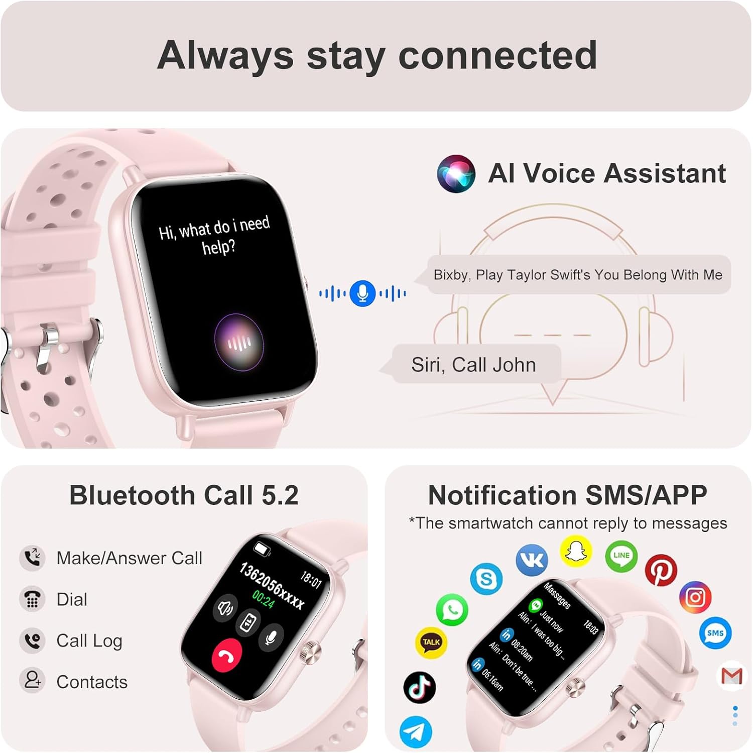 • 【Receive New Messages on Your Wrist】Stay seamlessly connected to the Smart watch to make/answer Bluetooth calls and receive SMS and APP messages (Facebook, WhatsApp, Twitter, etc.) – convenient for your life and never miss important notifications again. Note: After connecting Bluetooth, please turn on message and call notification in FitCloudPro APP (you cannot send messages or texts back)