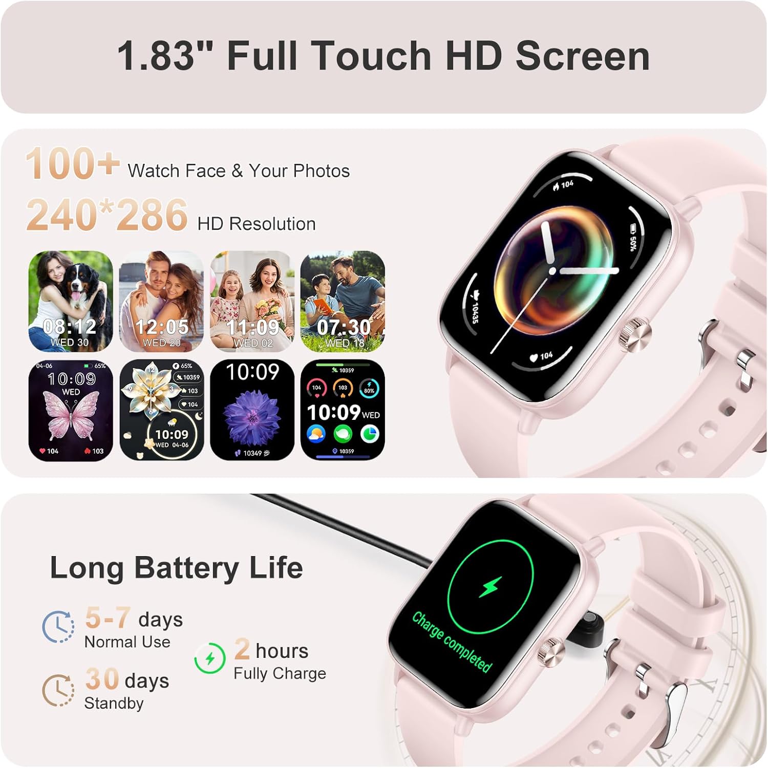 Smart Watch for Women(Answer/Make Call), 1.83″ HD Touch Screen Fitness tracker with Heart Rate SpO2 Sleep Monitor,100+ Sport Modes, IP68 Waterproof Smartwatch compatible with iOS & Android, Pink