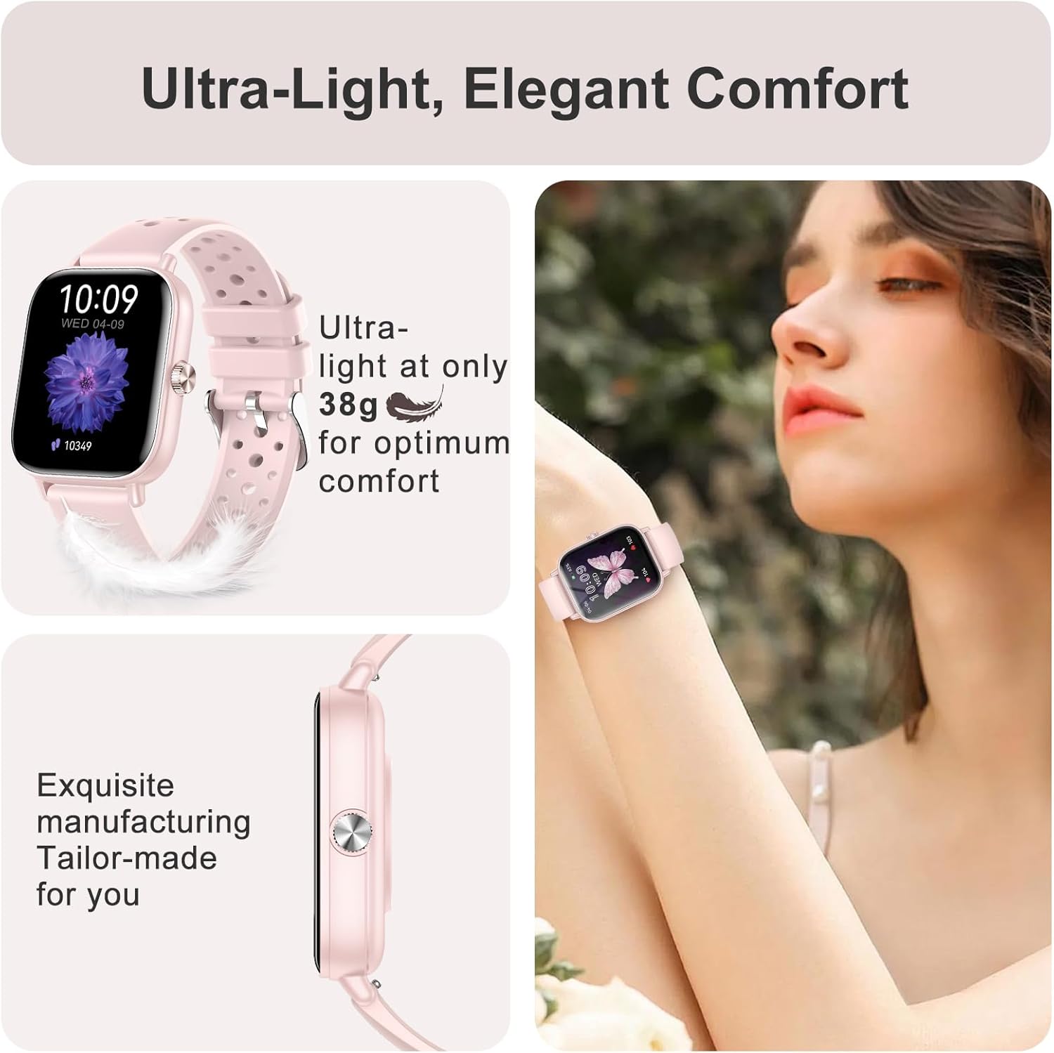 • 【Clear Screen, Comfortable Enjoyment】 Feature a 1.83 inch IPS eye protection screen, a 240 x 286 high-resolution full touch screen and a freely adjustable screen brightness, the women’s smartwatch offers you a clearer viewing experience and protects your eyes. There are 50+ dials to choose from in the app. You can also choose your own photos to design the dial with different styles and free adjustment. Comes with 2 straps of the same color but of 2 different styles that can be interchangeable according to taste