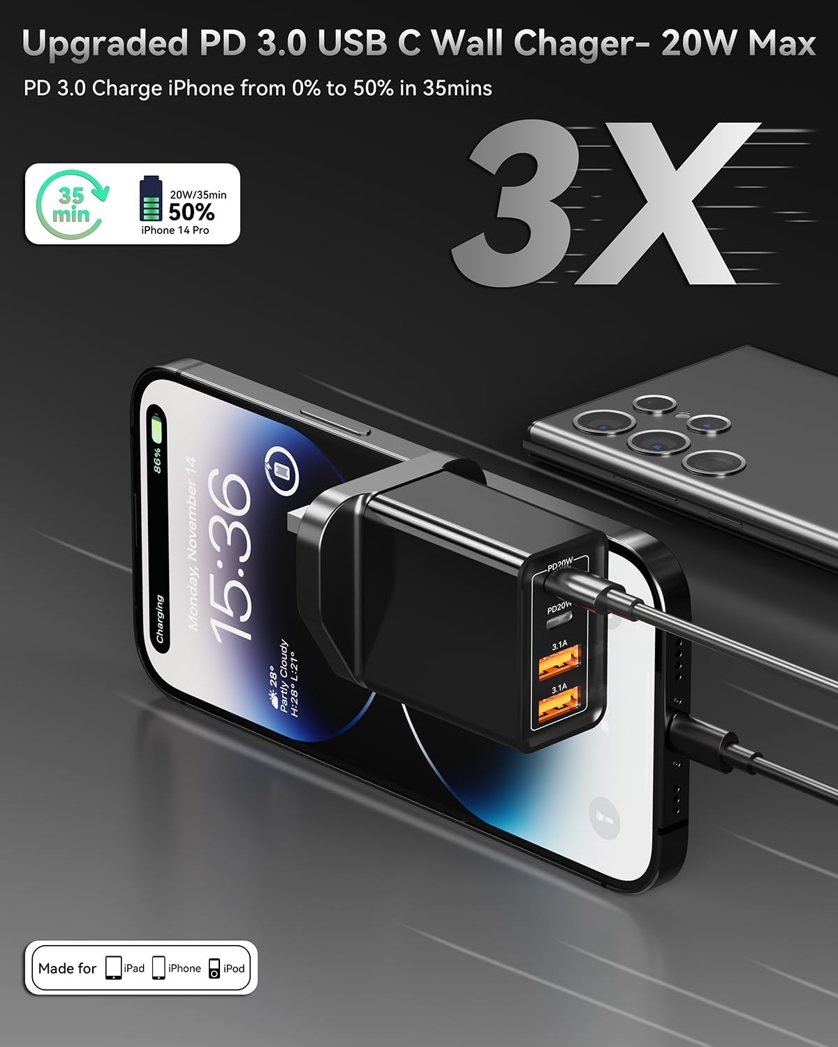 - ⚡【Versatile Charging Options】⚡ 40W USB C Fast Charger supports a maximum output of 40 watt in total. With 2 USB A(15W Max) and 2 USB C (20W Max) ports, our charger offers versatile charging options, allowing you to charge multiple devices simultaneously with our 40W USB C Fast Charger.